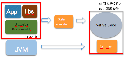 SVM 遵循封闭性假设(closed-world assumption, 即运行时所需的所有内容必须在编译时提供),将应用程序代码及其所依赖的三方 jar 文件和 Alibaba Dragonwell 代码编译为本地机器码,同时也将用 Java 编写的 Runtime 编译为机器码,两者被编到一个 elf 可执行文件或 so 共享库文件中,实现代码的自举。运行阶段只需直接执行 elf 文件,或者在其他 C/C++ 程序中调用 so 文件中发布的 API 即可。