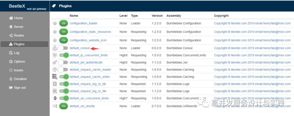 运行程序后进行配置管理工具的插件管理页面,可以看到Consul插件,组件默认是关闭需要进行一些配置。