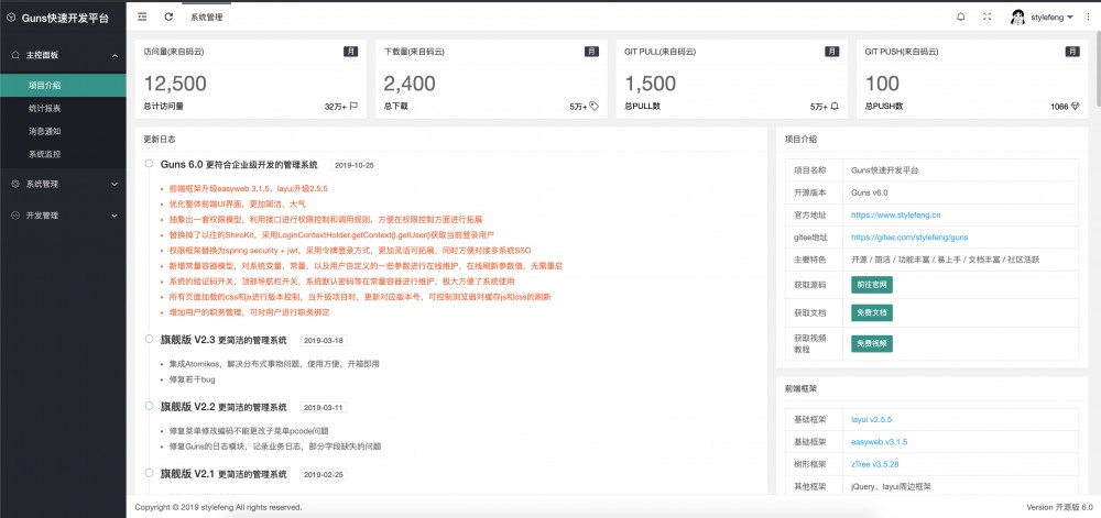 Guns基于SpringBoot 2,致力于做更简洁的后台管理系统,完美整合springmvc + spring security + jwt + mybatis-plus + beetl! Guns项目代码简洁,注释丰富,上手容易,同时Guns包含许多基础模块(用户管理,角色管理,部门管理,字典管理等10个模块),可以直接作为一个后台管理系统的脚手架!