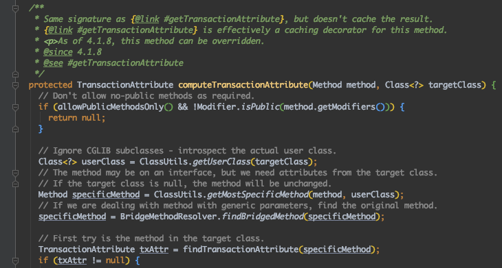 这个方法会检查目标方法的修饰符是不是 public,若不是 public,就不会获取 @Transactional 的属性配置信息,最终会造成不会用 TransactionInterceptor 来拦截该目标方法进行事务管理