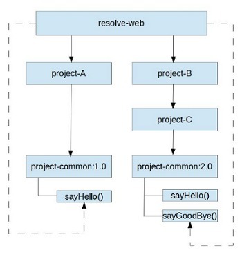 我们有一个 web 应用 resolve-web ,该工程依赖于 project-A 和 project-B , project-A 依赖于 project-common 的 1.0 版本并调用其中的 sayHello() 方法。 project-B 依赖于 project-C ,而 project-C 又进一步依赖于 project-common 的2.0 版本并调用其中的 sayGoodBye() 方法。 project-common 的 1.0 和 2.0 版本是不同的,1.0 中之包含 sayHello() 方法,而2.0 中包含了 sayHello() 和 sayGoodBye() 两个方法。整个项目的依赖关系如下图: