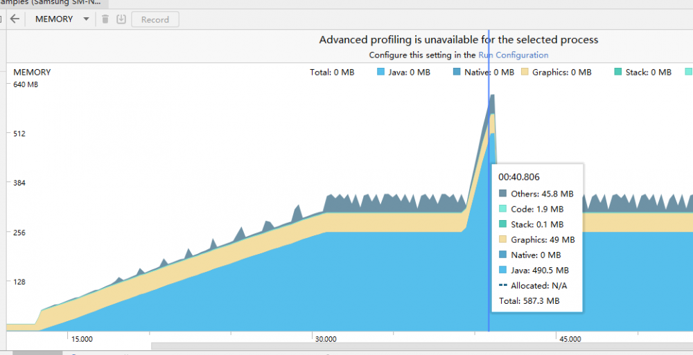 我们对上面的代码做一点点修改,注释了 observeOn(AndroidSchedulers.mainThread()),会发现内存显示很正常,不会存在上述问题。
