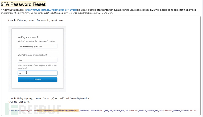 这节课程首先给了我们一个2016年的PayPal双因子密码重置的漏洞:攻击者通过去掉安全问题验证报文中的两个安全问题,结果通过了验证,从而达到了身份认证绕过。