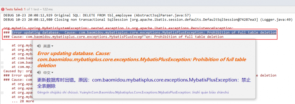 执行该方法后我们会看到测试方法执行失败,提示我们禁止全表的删除: