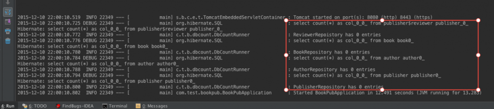 可以看出我们自己定义的注解起作用了。如果没有spring.factories,那么在程序启动的时候Spring Boot的自动配置机制不会试图解析 DbCountAutoConfiguration 类。一般来说,@Component注解的作用范围就是在BookPubApplication所在的目录以及各个子目录,即com.test.bookpub.*,而DbCountAutoConfiguration是在org.test.bookpubstarter.dbcount目录下,因此不会被扫描到。