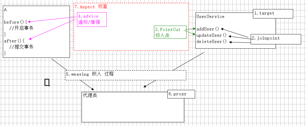 * 代理类:将目标类(切入点)和 切面类(通知) 结合