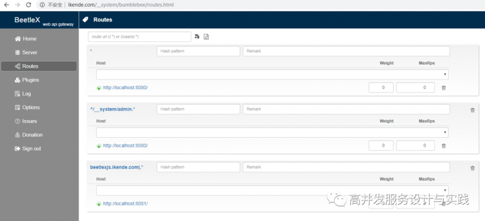 Bumblebee配置路由解释,只需要加载 BeetleX.Bumblebee.Configuration 插件启动后在 Routes 中配置即可.