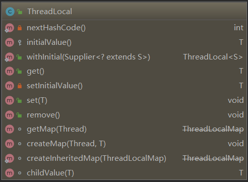 具体看了源码发现差不多,不过使用内部自己实现的一个ThreadLocalMap类,内部还一个Entry类而且Entry类继承weakRefrence(说实话第一次遇到弱应用,以前只是在jvm那本书学习了下),具体方法如下: