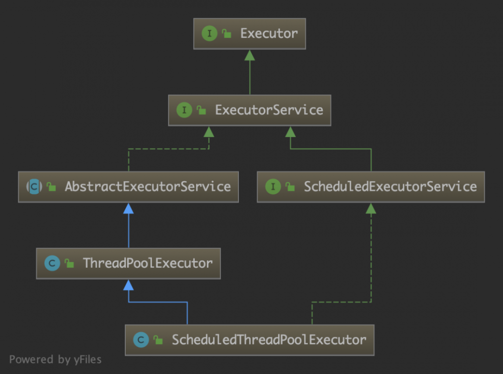 2. 它继承自 ThreadPoolExecutor,并实现了 ScheduledExecutorService 接口;