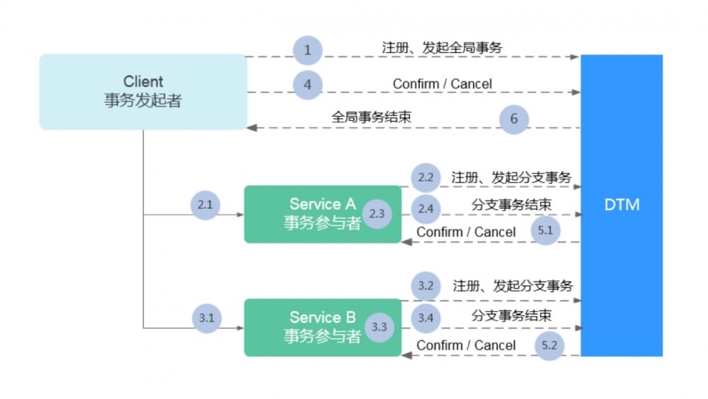 DTM 是华为云分布式事务管理中间件,它的具体步骤是,先由实物发起者向 DTM 集群申请注册一个全局事务的 ID,并透传到所调用的事务参与者中,事务参与者利用得到的 ID 向 DTM 集群注册申请一个分事务 ID,在事务参与者完成自身业务逻辑后,将结果上传至 DTM 集群,并示意分支事务结束,在后续完成 TCC 二阶段后,DTM 集群通稿事务发起者全局事务结束。具体流程如下图所示: