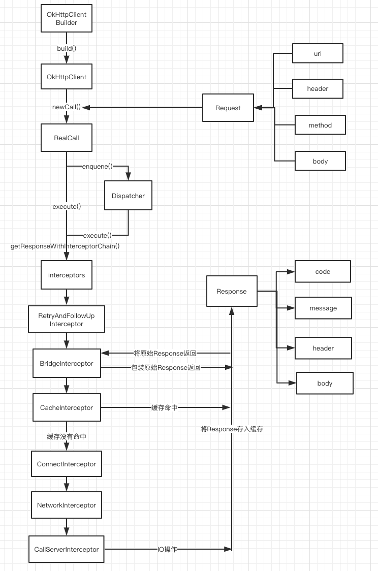 整体来说,是 OkHttpClient 通过 newCall 方法,进而触发 RealCall的execute (同步)、 enquene (异步)方法,经过一系列的 interceptors (拦截器),最后经过IO操作发起请求得到 Response (响应数据)。