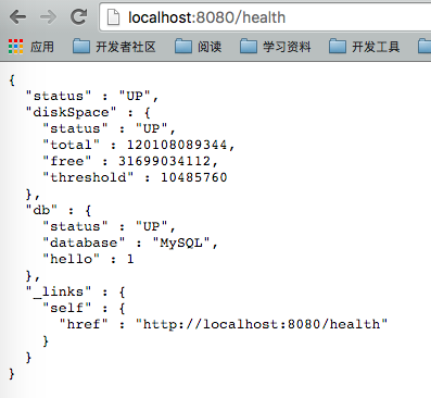 上述各个endpoint是Spring Boot Actuator提供的接口和方法,接下来看看我们自己定制的 HealthIndicator ,我们只需要实现 HealthIndicator 接口,Spring Boot会收集该接口的实现,并加入到 /health 这个endpoint中。