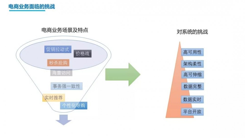 可以从上图里看到:对高可用性的要求是非常高的,需要99.99%的高可用性。快速迭代对对系统容性的要求很高,从几万单变成几十万单、百万单,架构上不能影响快速迭代,所以有空中加油或者是高速公路换轮胎的说法。
