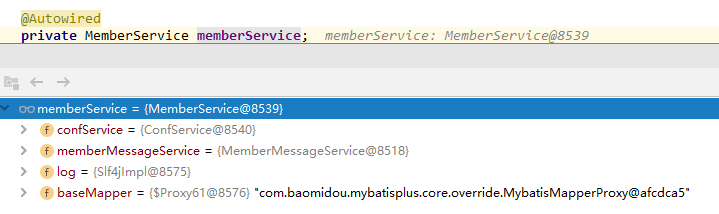 这时候我突然想到,该不会是MemberService这个类没有被代理吧,在Controller中打断点查看发现MemberService压根就不是代理对象, @Autowired 注入的是原始对象的实例。