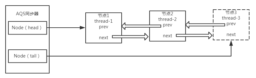 AQS全称AbstractQueuedSynchronizer,顾名思义也就是“抽象队列同步器”,它不是一个可以直接拿来使用的类,而是将锁的公共操作功能提取成一个抽象类,供锁的具体实现类使用,比如后面会讲到的ReentrantLock就是基于AQS实现锁的操作的。AQS内部使用多个Node连接成的队列来实现锁等待线程的管理,当锁释放时,会唤醒head的下一个线程来竞争锁。内部队列图如下: