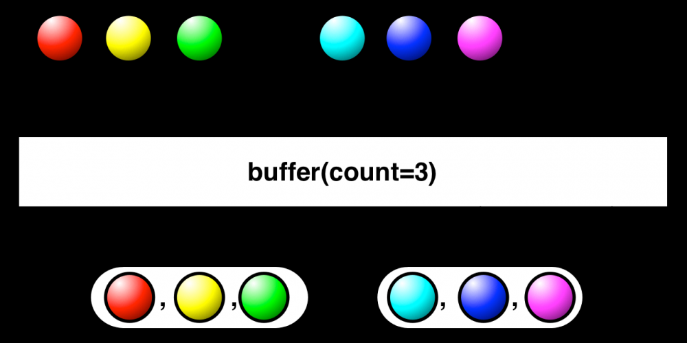 buffer 操作符将一个 Observable 转换为一个 Observable,这个 Observable 用于收集原来发送的数据,然后发送这些缓存的数据集合,buffer 将发送的单个事件转换成元素集合,下面是针对此种情况的官方示意图: