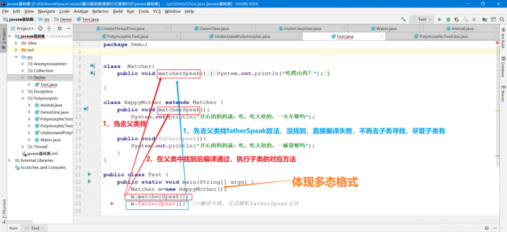 回过头来看烤山药例子,确实都有继承,同样都重写了 motherSpeak() 方法,最关键的代码则是