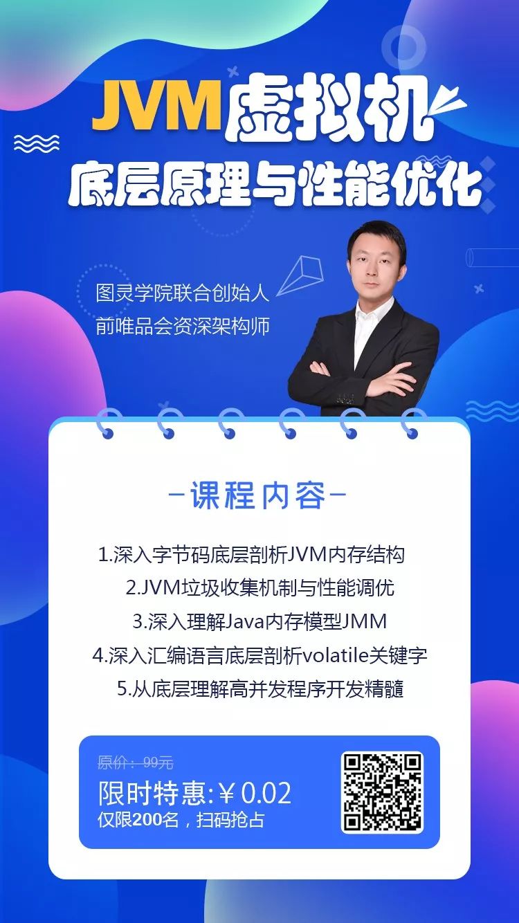这次,我联合腾讯课堂图灵学院,为大家准备了一门专题课程 《JVM虚拟机底层原理分析与性能优化》 。 原价99元 ,本号粉丝特惠,只要 0.02 元。先到先得。