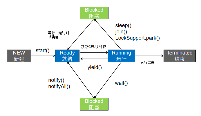 上图表述了线程的各个状态及状态间切换的操作,主要的五种状态如下,