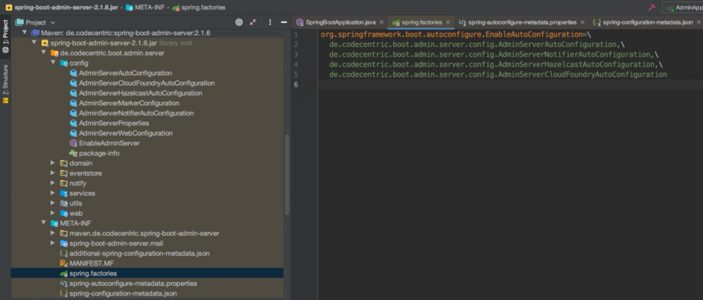 org.springframework.boot.autoconfigure.EnableAutoConfiguration=/ de.codecentric.boot.admin.server.config.AdminServerAutoConfiguration,/ de.codecentric.boot.admin.server.config.AdminServerNotifierAutoConfiguration,/ de.codecentric.boot.admin.server.config.AdminServerHazelcastAutoConfiguration,/ de.codecentric.boot.admin.se rver.config.AdminServerCloudFoundryAutoConfiguration 复制代码