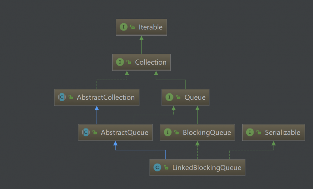 我们先来看看LinkedBlockingQueue的继承体系。 使用IntelliJ IDEA查看类的继承关系图形