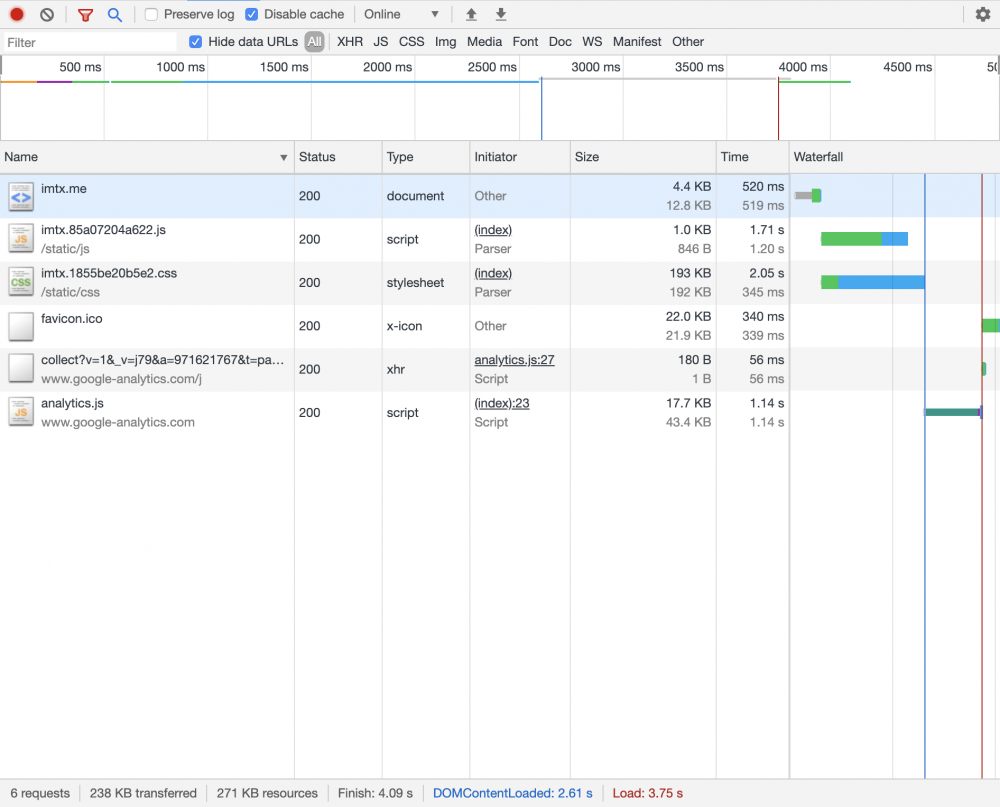 我的 Blog 架构比较简单,问题不出在后端,通过 Chrome 的 Developer Tools 的 Network 可以评测得出,还是出在网络访问性能上:这个 1KB 的 JS 文件和 193 KB 的 CSS 文件,一共花了 1.5s 秒才载入成功。整体的载入性能(以 DOMContentLoaded 为准),也因此达到了 2.61 秒。见图:
