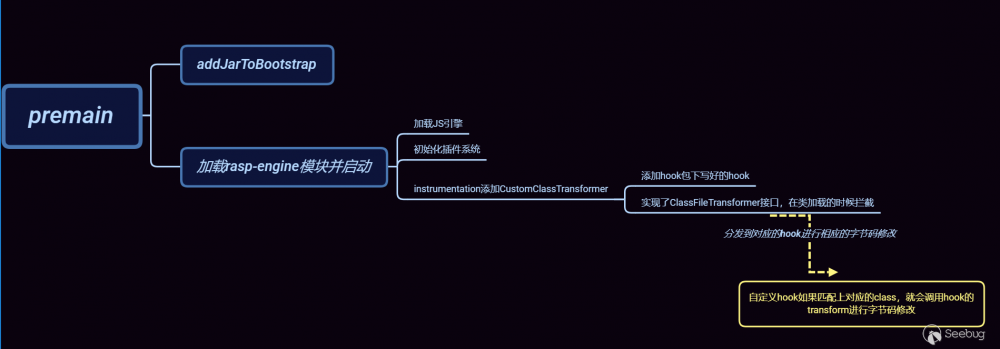 OpenRasp的入口在agent的premain方法,premain方法会在main方法运行之前先运行。大概梳理了一下与instrumentation有关的调用的流程