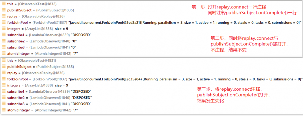 在调用 subscribe1.dispose() 的时候,完成了订阅者自行解除订阅关系的约定,而假如后面调用的是 replay.connect(consumer -> consumer.dispose()) ,依然会在发送元素的过程中强行中断,不带任何通知。而在使用 publishSubject.onComplete() 后,则可以很优雅地通知后续订阅者优雅地结束。 如图 2-3 所示,我们按照图中文字操作,并在 System.out.println("test") 这行打断点查看状态,发现其他2个订阅者并没有被移除,为什么会出现这种情况?