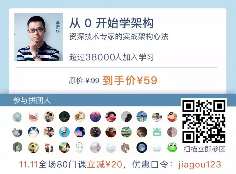 极客时间 11.11 优惠 ,《从0开始学架构》 超值参团 ¥79 ,原价 ¥99,再加上全场 立减¥20优惠口令 : jiagou123 , 到手价¥59 。