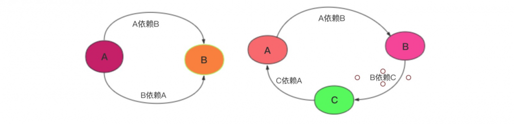 循环依赖,简单地说,就是循环引用,两个或者多个 bean 相互之间的持有对方,形成一个闭环。如,A 依赖 B,B 又依赖 A,它们之间形成了循环依赖,又或者是 A 依赖 B,B 依赖 C,C 又依赖 A。可以用一张简图描述这种依赖关系。