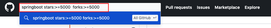 例子: springboot stars:>=5000 //搜索springboot有关star数>=5000的内容