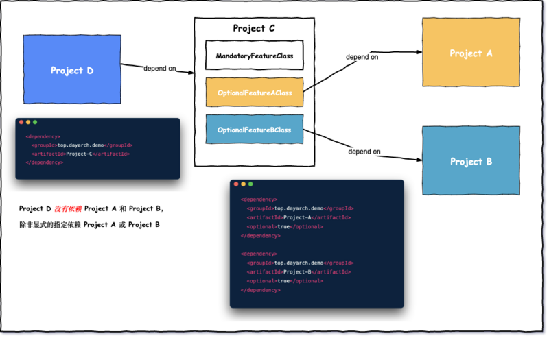如果 project D 确实需要用到 project C 中的 OptionalFeatureAClass 怎么办呢?那我们就需要在 project D 的 pom.xml 中显式的添加声明 project A 依赖,继续看下图: