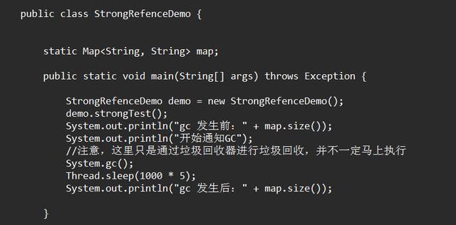 从输出的结果可以看到,即使我们通过把key和value 设置为null 来告诉jvm,我们不再使用这个对象了,map 里面对象依然没有被GC 回收,因为key和value 被一个强引用map 指向,根据可达性判断,垃圾回收器是不能回收掉key和value 这个对象的。map 被定义为statis 的静态变量,是一个使用生命周期很长的对象。在strongTest()方法中存在了一个key和value 的局部变量,它随着方法的执行完,这个变量的生命使用周期就结束了,但是粗糙的程序员忘记remove 了,这个时候垃圾回收器是不能回收它的。如果这种生命周期相对短的对象很多,最终就有可能消耗掉JVM中全部的内存。