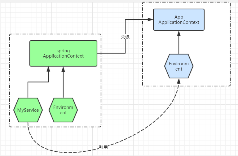 关键代码如下所示,定义一个类继承spring boot的SpringApplication类,覆盖其createApplicationContext方法,在方法中首先创建应用的ApplicationContext,并注入应用所定义的Environment Bean,随后将其设置为spring boot ApplicationContext的父级。为了更好的演示向上回溯查找Bean的效果,特意定义了一个MyService Bean,这个Bean注入到spring boot ApplicationContext中,并且在MyService Bean中自动注入对应用所定义的Environment Bean的依赖。当应用程序启动之后,没有报错。说明了MyService Bean成功注入了父级的application context中所定义的Environment Bean