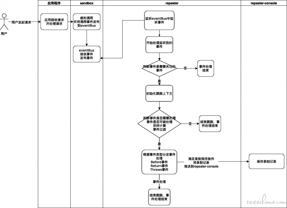 如下图,描述了用户触发请求,当sandbox感知到调用事件到录制结果保存的过程。