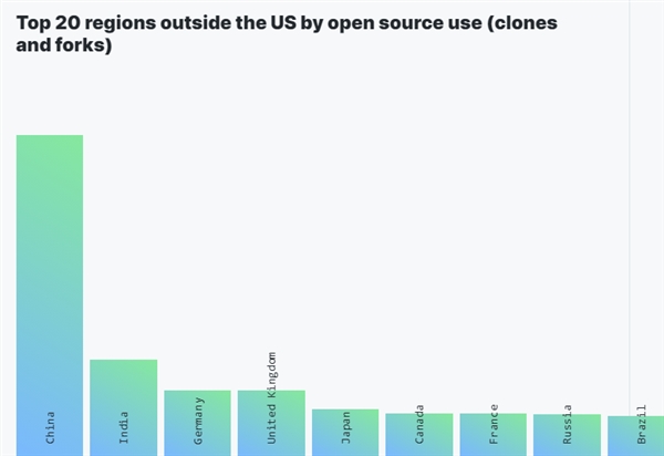 地区方面,自2014年以来,美国以外的repo贡献量就开始占据主导,过去的1年更是达到了80%。 在美国之后,来自中国开发者fork/clone的项目最多,同比增长48%,再之后还有印度、德国、英国、日本等。