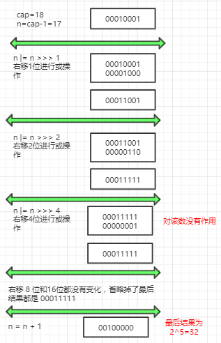~~~ java// Returns a power of two size for the given target capacitystatic final int tableSizeFor(int cap) {int n = cap - 1;n |= n >>> 1;n |= n >>> 2;n |= n >>> 4;n |= n >>> 8;n |= n >>> 16;return (n<0) ? 1 : (n >= MAXIMUM CAPACITY) ? MAXIMUM CAPACITY : n + 1;}~~~