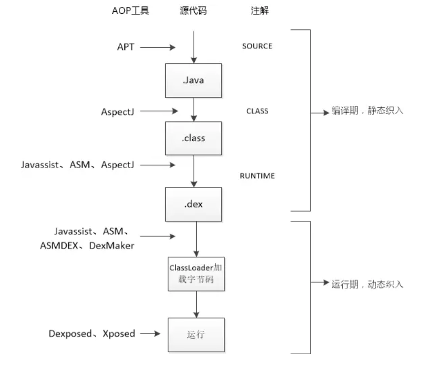 不同方法在java的完整周期(类加载期间,编译期,运行期间等)中 不同的时间段插入切面的方式不同 (即我们想要他在这个时间完成的方法,这里建议先了解 AOP的5种增强类型 )。
