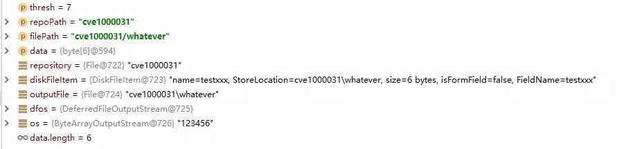 其中的 tempDir 就是我们设置的 repository ,即 cve1000031 。 tmpFileName 是由 DiskFileItem 是自动生成的。最终和 tempDir 组合得到的文件路径就是 cve1000031/upload_7b496a67_4fc4_4b14_a4e7_ff5aceb82aaf_00000000.tmp 。