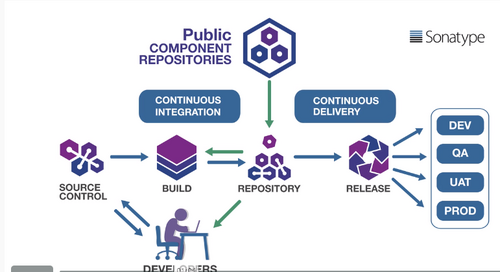 程序员从源码库(Source Control)中下载源代码,编写程序,完成后提交代码到源码库,持续集成(Continuous Integration)工具从源码库中下载源代码,编译源代码,然后提交到运行库(Repository),然后持续交付(Continuous Delivery)工具从运行库(Repository)中下载代码,生成发布版本,并发布到不同的运行环境(例如DEV,QA,UAT, PROD)。