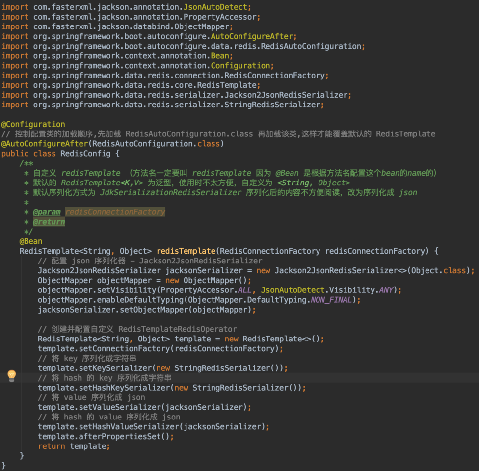 // 控制配置类的加载顺序,先加载 RedisAutoConfiguration.class 再加载该类,这样才能覆盖默认的 RedisTemplate