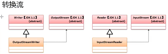 所谓的转换流指的是可以实现字节流与字符流操作的功能转换,例如:进行输出的时候 OutputStream 需要将内容变为字节数组后才可以进行输出,而 Writer 可以直接输出字符串,这一点是方便的,所以很多人就认为需要提供有一种转换的机制,来实现不同流类型的转化操作,为此在 java.io 包里面提供有两个类: InputStreamReader 、 OutputStreamWriter 。