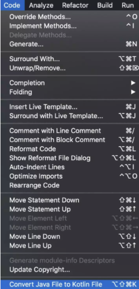 在将现有代码更新为 Kotlin 代码时,可以直接使用 Android Studio 提供的 Java 转 Kotlin 工具,只需要在菜单中选择 “Code → Convert Java File to Kotlin File” 即可: