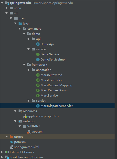 com.mars.demo 和 com.mars.framework ,以便随后只扫描业务代码。 servlet-api 包,仅供编译器使用,所有配置 scope 为 provided 。 首先新建一个 HttpServlet 的实现类 MarsDispatcherServlet ,用来接收请求。