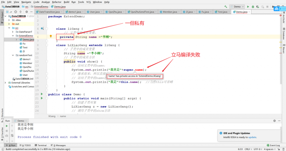 同学你有没有想过这样一个问题。如果父类中的成员变量 非私有:子类中可以直接访问。 私有:子类是不能直接访问的。如下: