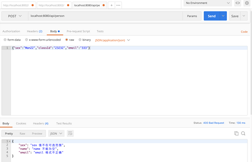 我们在需要验证的参数上加上了 @Valid 注解,如果验证失败,它将抛出 MethodArgumentNotValidException 。默认情况下,Spring会将此异常转换为HTTP Status 400(错误请求)。