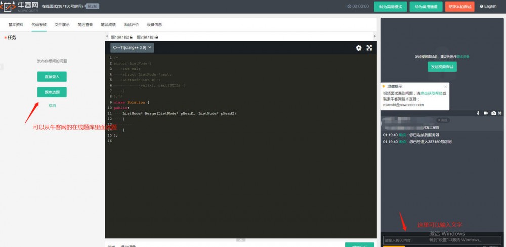 看完简历后,就是约面试了,leader让我约面试,电话面试就行,但是我想得还是视频面试一下,也能看看在线编程,所以我自己去牛客网认证了一下,成为了牛客网的面试官,可以发起视频面试,可以看到面试者手写代码,也可以看到面试者有没有切出去浏览器界面,正常面试者应该不会频繁切除当前的视频面试界面,作用还是很大。