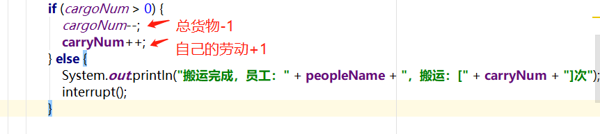 例子中用到了synchronized和AtomicInteger,是为了保证货物剩余总量在多人搬运下,数值也是对的,可以尝试将AtomicInteger换成Integer或者去除synchronized,两人最终总计搬运和将与原货物总量不一致。