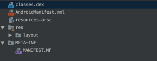 APK文件本身是个压缩文件,我们可以通过一个简单的 Hello Android 示例和一个复杂的应用,对比其对应的APK文件。 首先新建一个简单的 Hello Android 项目,build出一个APK文件后拖到AS中利用自带的 apkanalyzer 打开,基本组成如图: