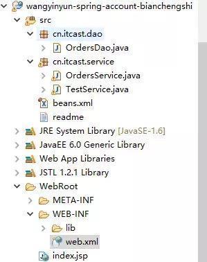 <!-- 配置c3po连接池 --> <bean id="dataSource" class="com.mchange.v2.c3p0.ComboPooledDataSource"> <!-- 注入属性值 --> <property name="driverClass" value="com.mysql.jdbc.Driver"></property> <property name="jdbcUrl" value="jdbc:mysql://localhost:3306/wangyiyun"></property> <property name="user" value="root"></property> <property name="password" value="153963"></property> </bean> <!-- 第一步:配置事务管理器 --> <bean id="dataSourceTransactionManager" class="org.springframework.jdbc.datasource.DataSourceTransactionManager"> <!-- 注入dataSource --> <property name="dataSource" ref="dataSource"></property> </bean> <!-- 第二步:配置事务增强 --> <tx:advice id="txadvice" transaction-manager="dataSourceTransactionManager"> <!-- 做事务操作 --> <tx:attributes> <!-- 设置进行事务操作的方法匹配规则 --> <!-- account开头的所有方法 --> <!-- propagation:事务传播行为; isolation:事务隔离级别; read-only:是否只读; rollback-for:发生那些异常时回滚 timeout:事务过期时间 --> <tx:method name="account*" propagation="REQUIRED" isolation="DEFAULT" read-only="false" rollback-for="" timeout="-1" /> </tx:attributes> </tx:advice> <!-- 第三步:配置切面 切面即把增强用在方法的过程 --> <aop:config> <!-- 切入点 --> <aop:pointcut expression="execution(* cn.itcast.service.OrdersService.*(..))" id="pointcut1" /> <!-- 切面 --> <aop:advisor advice-ref="txadvice" pointcut-ref="pointcut1" /> </aop:config> <!-- 对象生成及属性注入 --> <bean id="ordersService" class="cn.itcast.service.OrdersService"> <property name="ordersDao" ref="ordersDao"></property> </bean> <bean id="ordersDao" class="cn.itcast.dao.OrdersDao"> <property name="jdbcTemplate" ref="jdbcTemplate"></property> </bean> <bean id="jdbcTemplate" class="org.springframework.jdbc.core.JdbcTemplate"> <property name="dataSource" ref="dataSource"></property> </bean> 复制代码